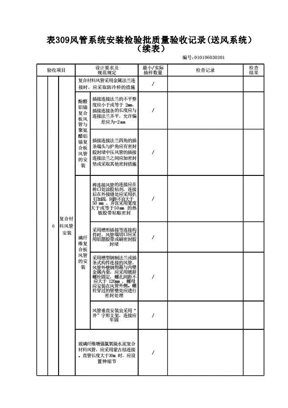 表格名称:010106030301 风管系统安装检验批质量验收记录(送风系统)