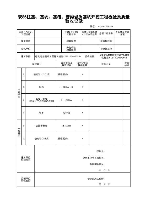 表格名称:010201020201 柱基、基坑、基槽、管沟岩质基坑开挖工程检验批质量验收记录