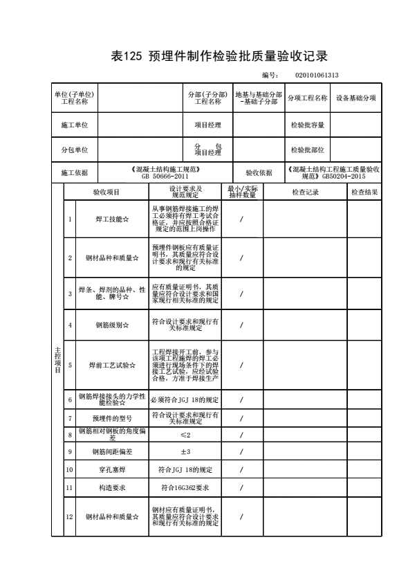 表格名称:020101061313 预埋件制作检验批质量验收记录