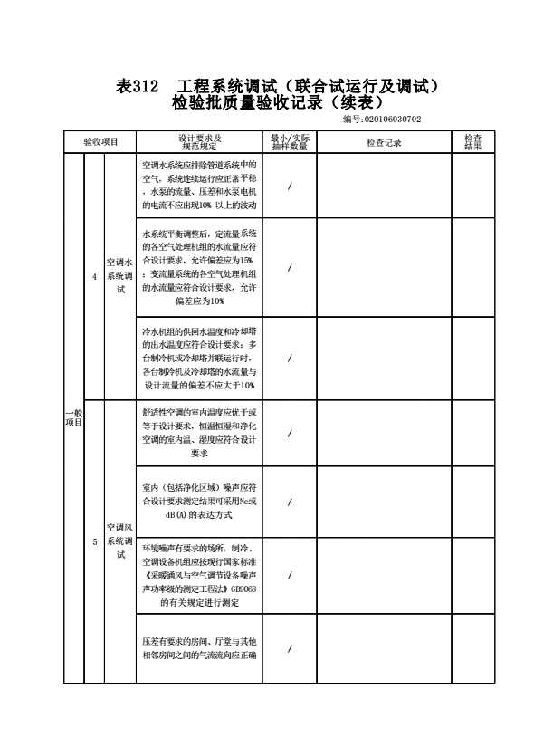 表格名称:020106030702 工程系统调试(联合试运行及调试)检验批质量验收记录