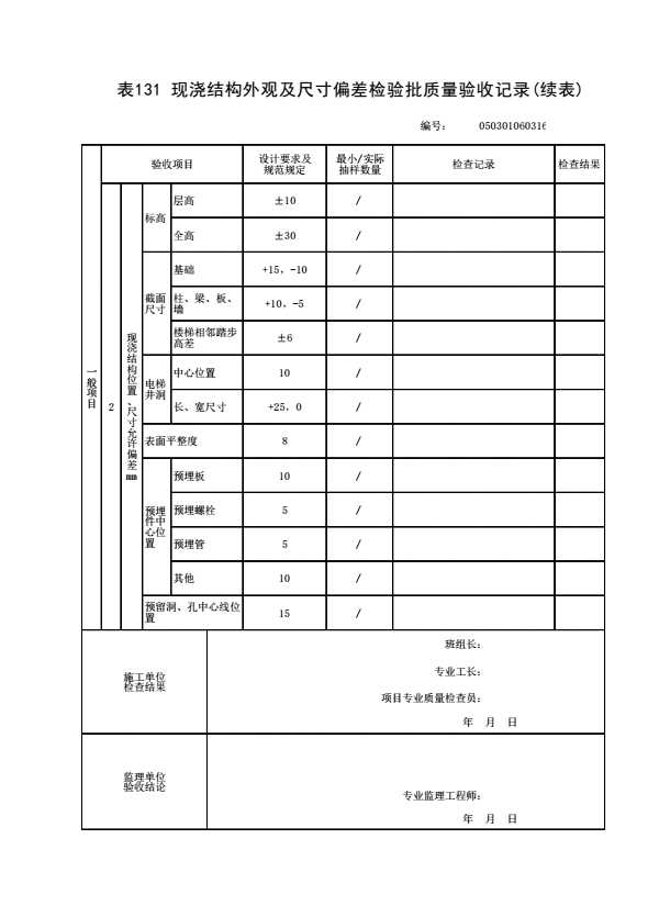 表格名称:050301060316 现浇结构外观及尺寸偏差检验批质量验收记录