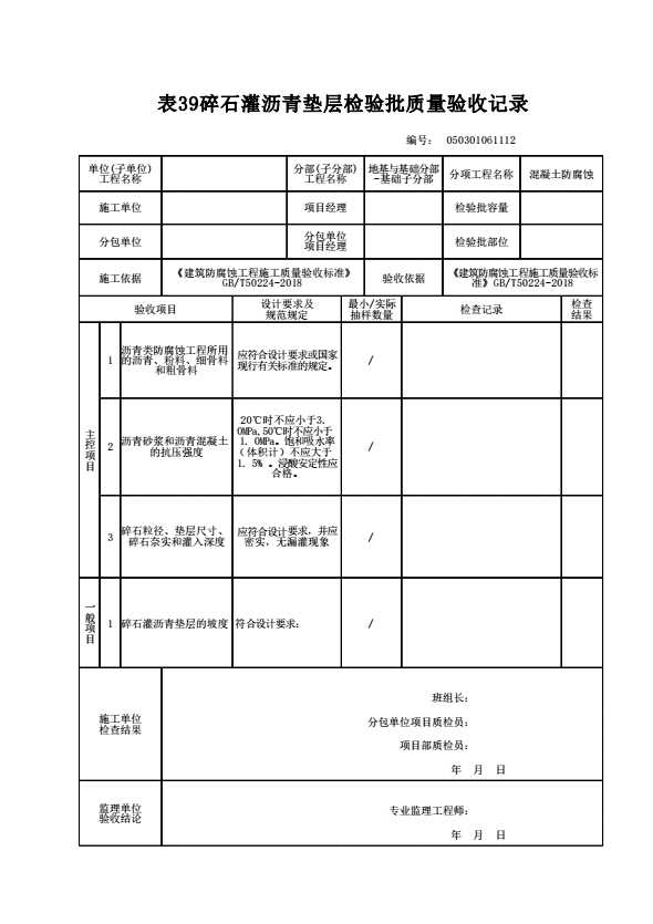 表格名称:050301061112 碎石灌沥青垫层检验批质量验收记录