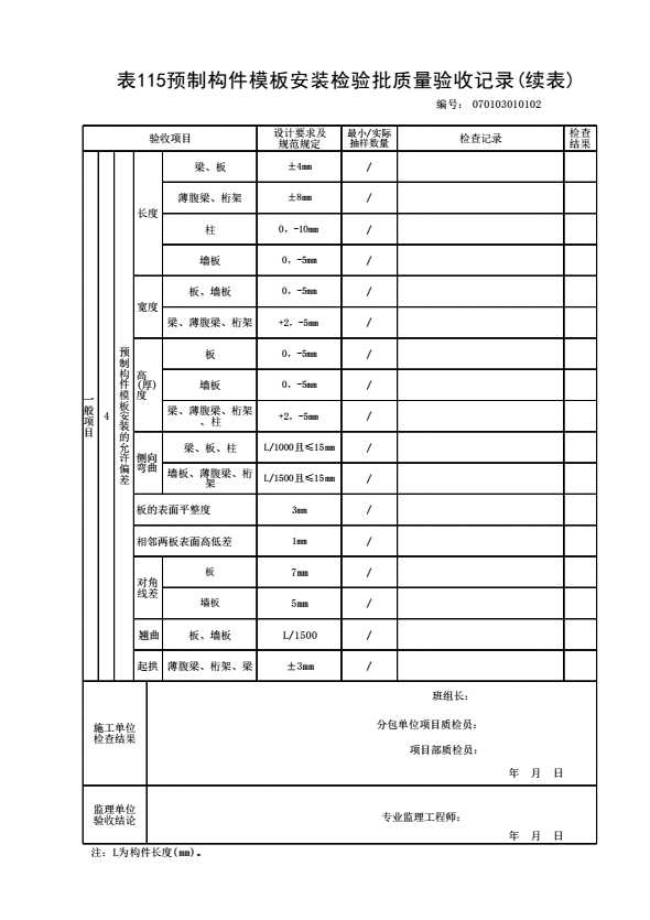 表格名称:070103010102 预制构件模板安装检验批质量验收记录