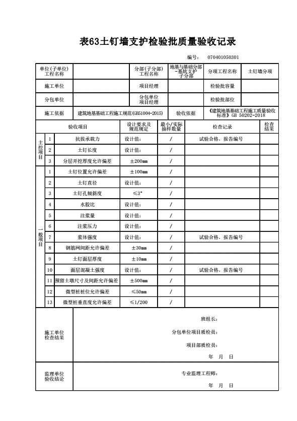 表格名称:070401050301 土钉墙支护检验批质量验收记录