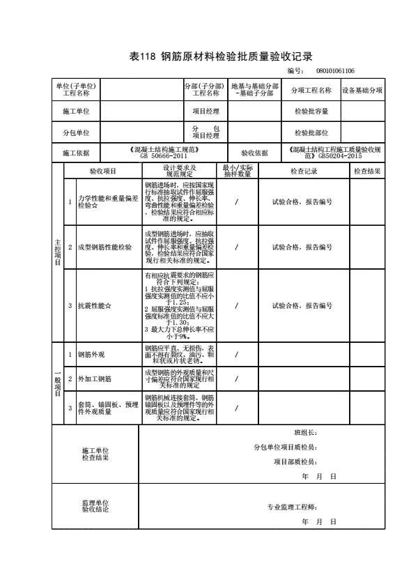 表格名称:080101061106 钢筋原材料检验批质量验收记录