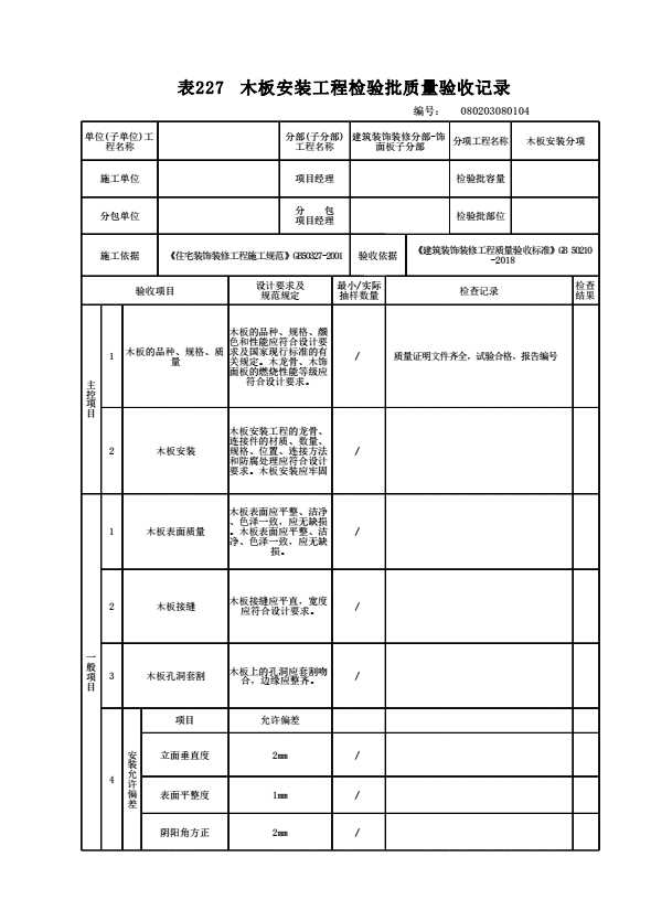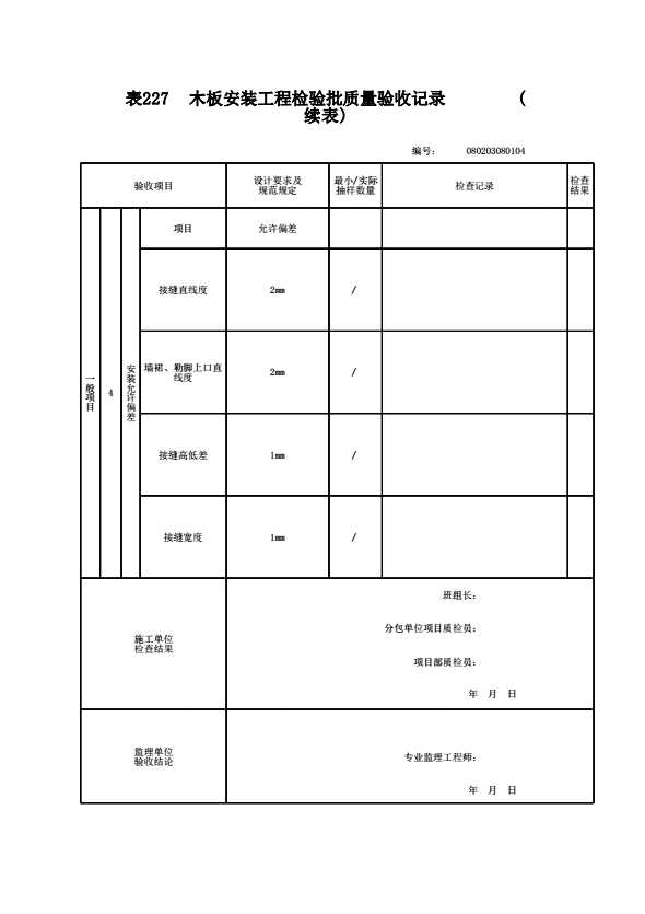表格名称:080203080104 木板安装工程检验批质量验收记录