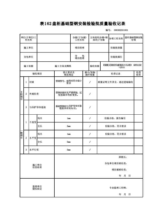 表格名称:080302031001 盘柜基础型钢安装检验批质量验收记录