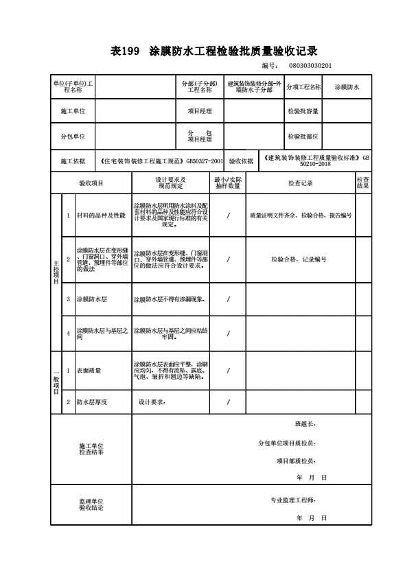 表格名称:080303030201 涂膜防水工程检验批质量验收记录
