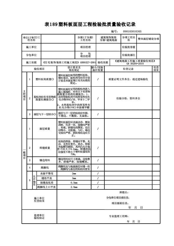 表格名称:090103010305 塑料板面层工程检验批质量验收记录