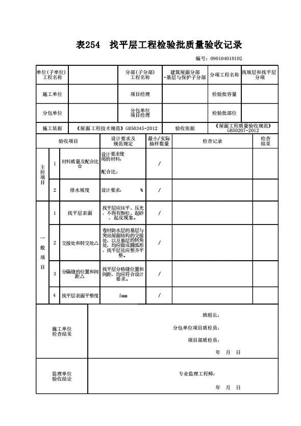 表格名称:090104010102 找平层检验批质量验收记录