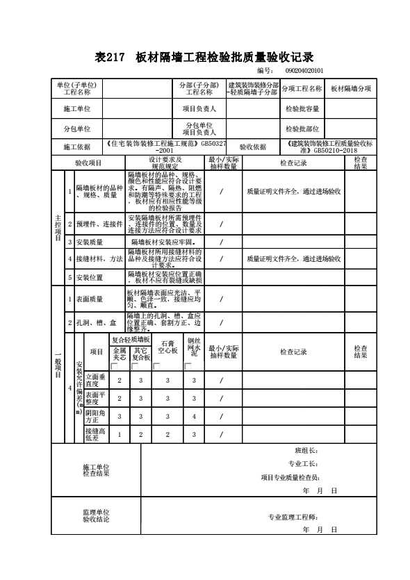 表格名称:090204020101 板材隔墙工程检验批质量验收记录