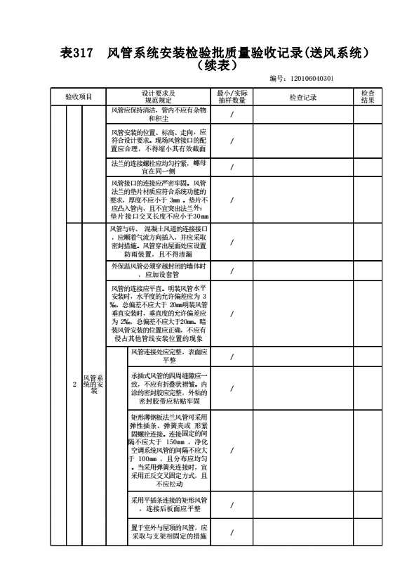 表格名称:120106040301 风管系统安装检验批质量验收记录(送风系统)