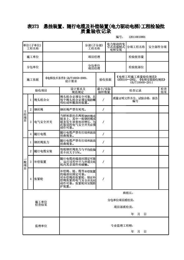 表格名称:120110010801 悬挂装置、随行电缆及补偿装置(电力驱动电梯)工程检验批质量验收记录