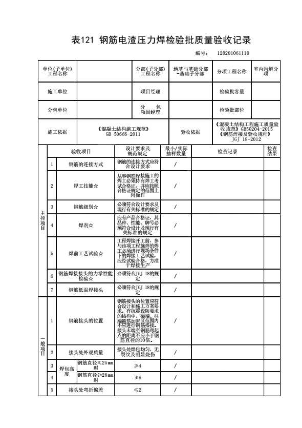 表格名称:120201061110 钢筋电渣压力焊检验批质量验收记录