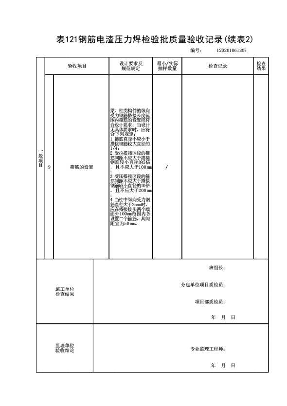表格名称:120201061309 钢筋电渣压力焊检验批质量验收记录