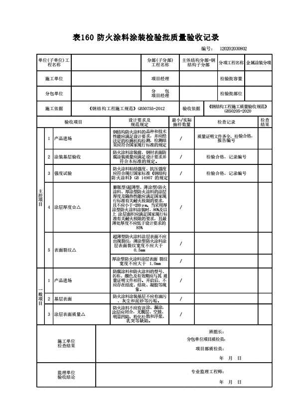 表格名称:120202030802 防火涂料涂装检验批质量验收记录