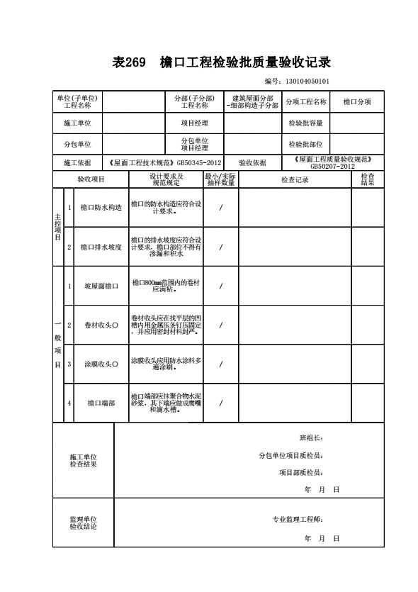 表格名称:130104050101 檐口工程检验批质量验收记录
