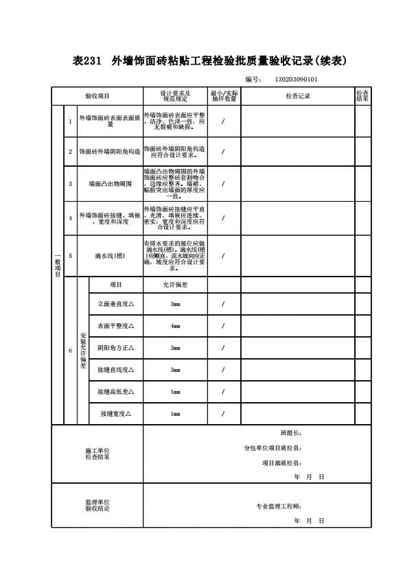 表格名称:130203090101 外墙饰面砖粘贴工程检验批质量验收记录