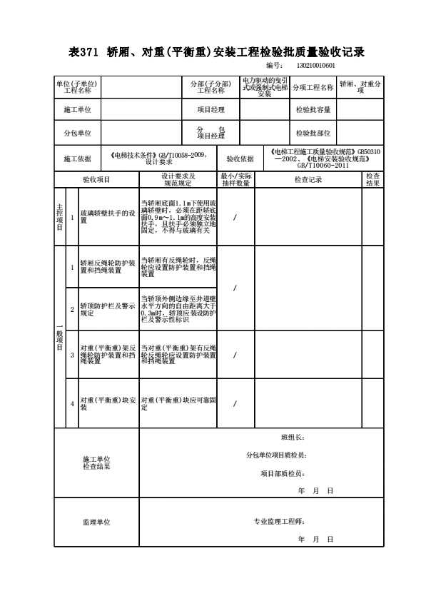 表格名称:130210010601 轿厢、对重(平衡重)安装工程检验批质量验收记录