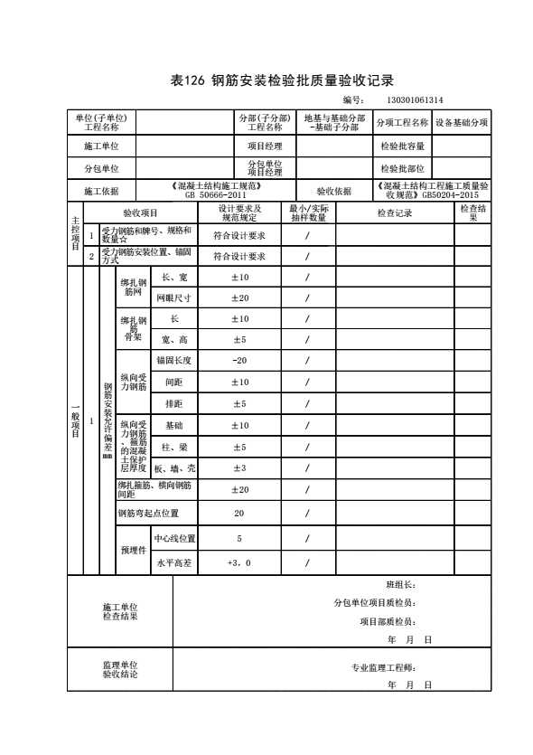 表格名称:130301061314 钢筋安装检验批质量验收记录
