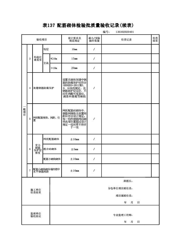 表格名称:130302020401 配筋砌体检验批质量验收记录