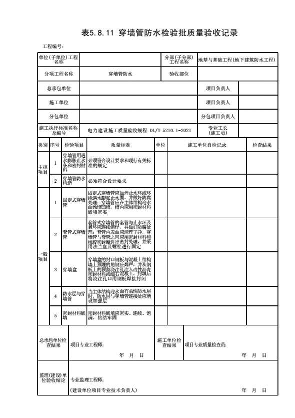 表格名称:表5.8.11 穿墙管防水检验批质量验收记录