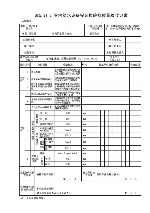 表格名称:表5.31.2 室内给水设备安装检验批质量验收记求