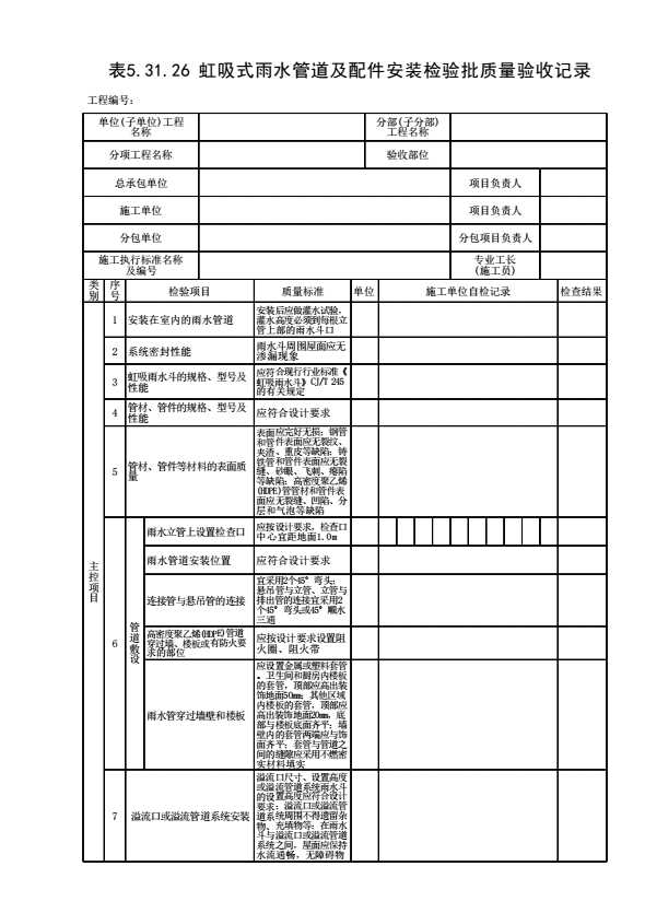 表格名称:表5.31.26 虹吸式雨水管道及配件安装检验批质量验收记录