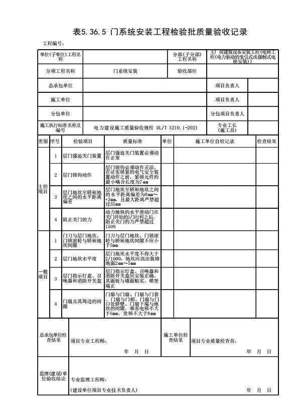表格名称:表5.36.5 门系统安装工程检验批质量验收记录