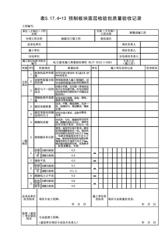 表格名称:表5.17.4-13预制板块面层检验批质量验收记录