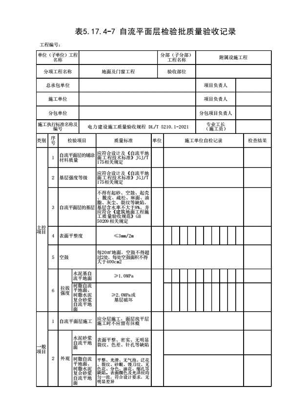 表格名称:表5.17.4-7 自流平面层检验批质量验收记录