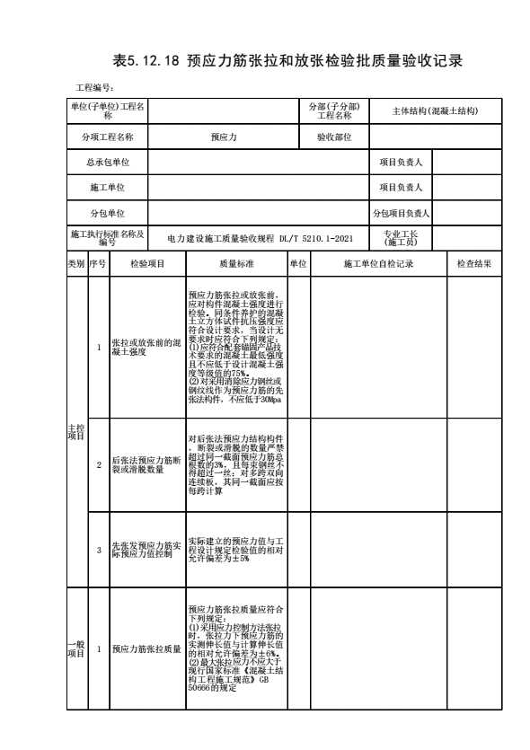 表格名称:[符合表5.12.18]表7.5.14挡煤墙预应力张拉与放张检验批质量验收记录