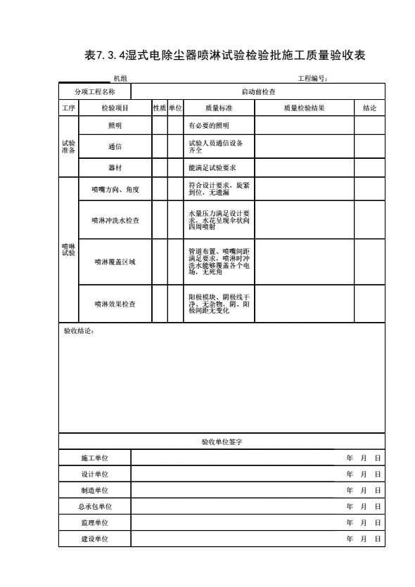 表格名称:表7.3.4 湿式电除尘器喷淋试验检验批施工质量验收表