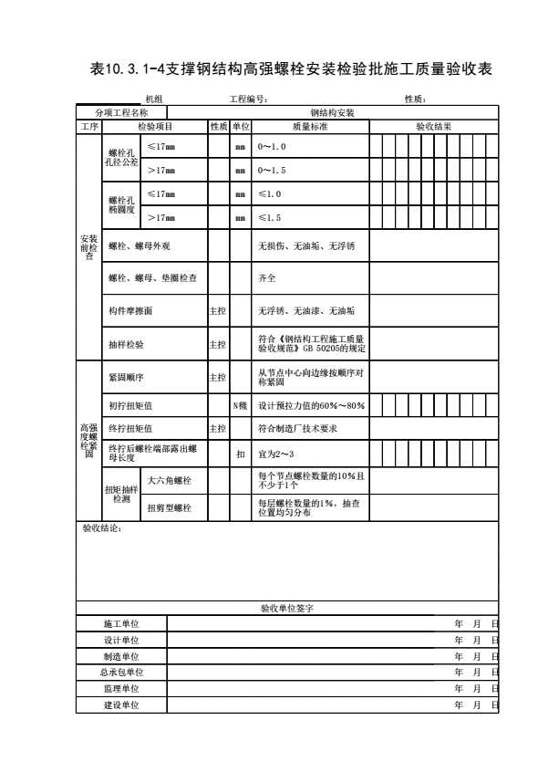 表格名称:表10.3.1-4 支撑钢结构高强螺栓安装检验批施工质量验收表