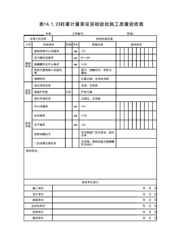表格名称:表14.1.23 柱塞计量泵安装检验批施工质量验收表