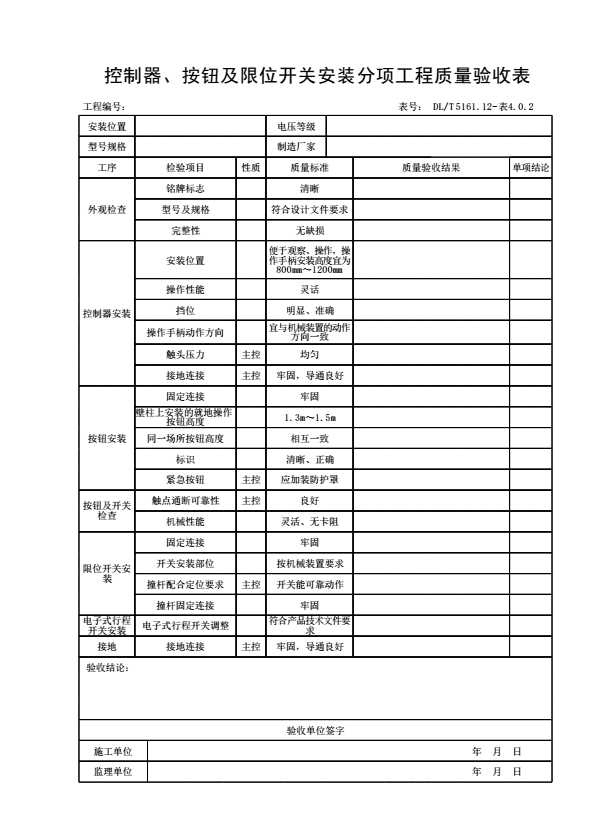 表格名称:表4.0.2 控制器、按钮及限位开关安装分项工程质量验收表