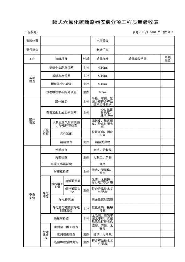 表格名称:表2.0.3 罐式六氟化硫断路器安装分项工程质量验收表