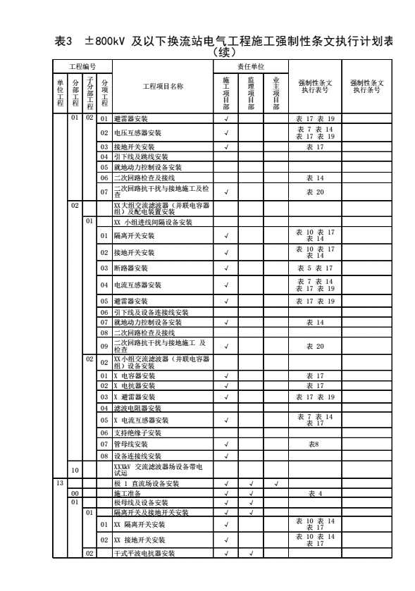 表3 ±800kV 及以下换流站电气工程施工强制性条文执行计划表