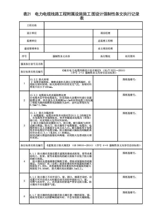 表21 电力电缆线路工程附属设施施工图设计强制性条文执行记录表