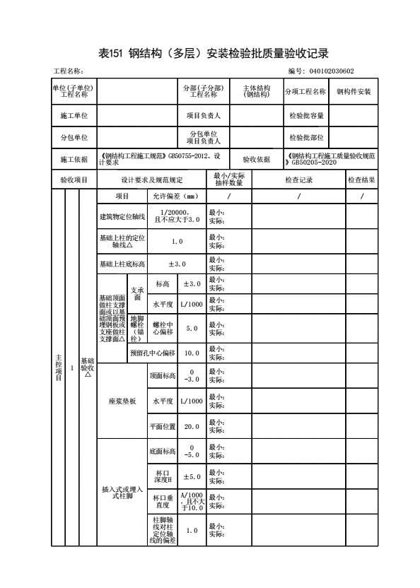 表格名称:040102030602 钢结构(多层)安装检验批质量验收记录