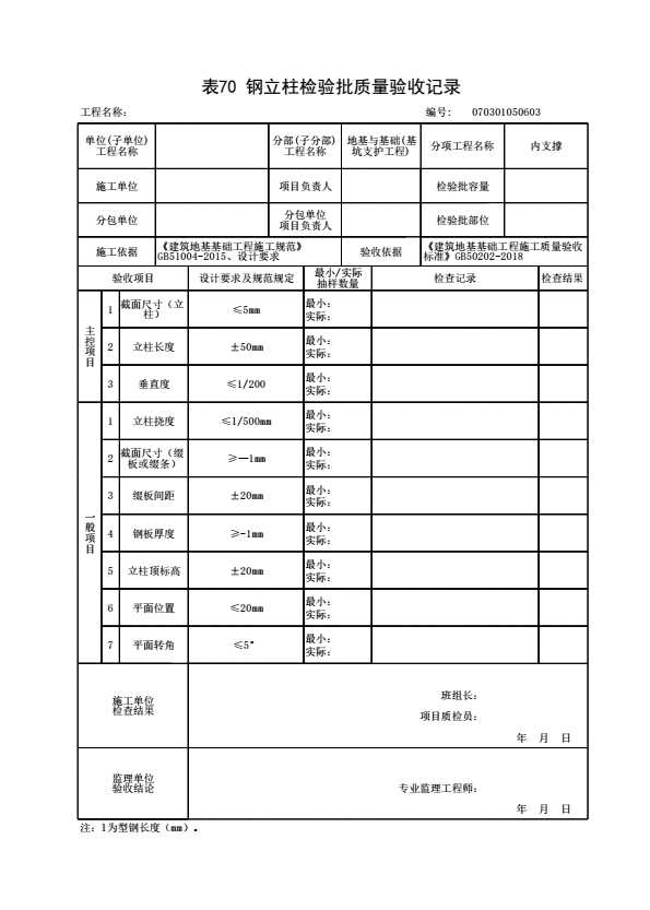 表格名称:070301050603 钢立柱检验批质量验收记录