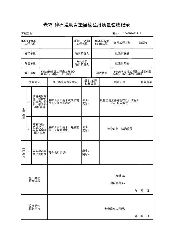 表格名称:100201061312 碎石灌沥青垫层检验批质量验收记录