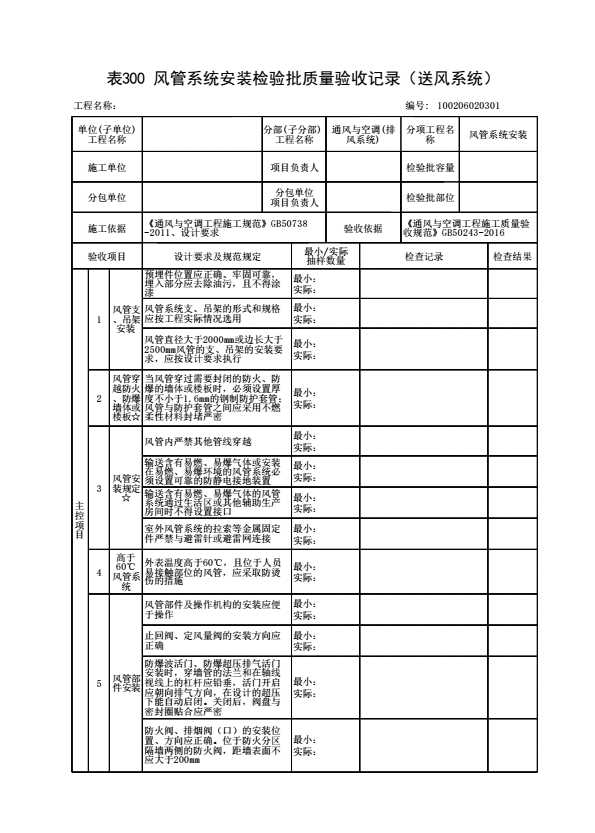表格名称:100206020301 风管系统安装检验批质量验收记录(送风系统)