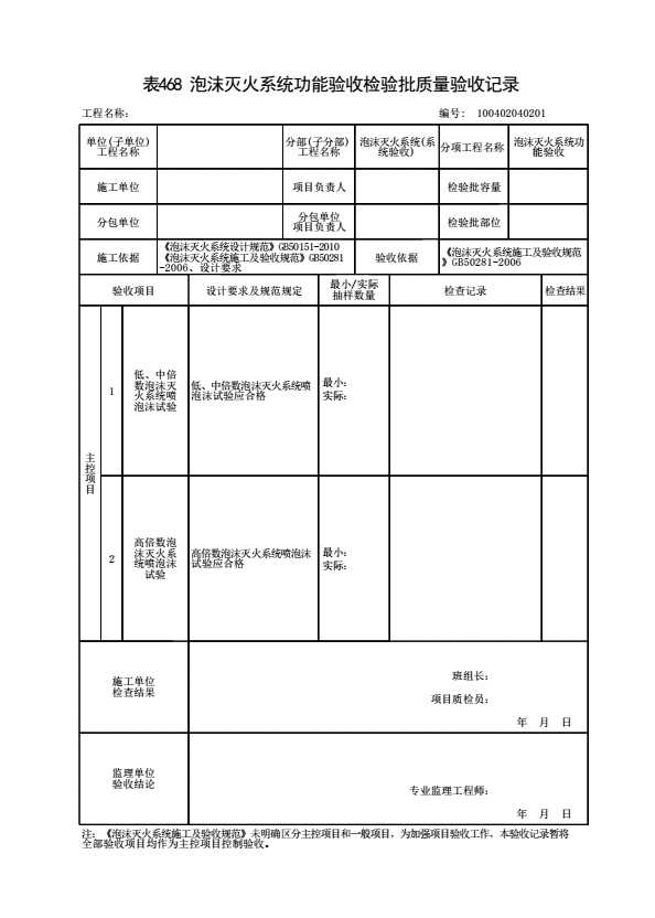 表格名称:100402040201 泡沫灭火系统功能验收检验批质量验收记录