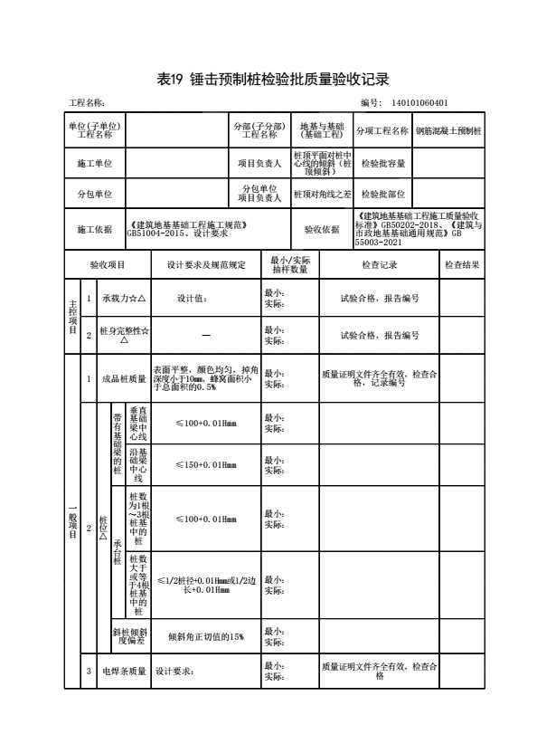表格名称:140101060401 锤击预制桩检验批质量验收记录