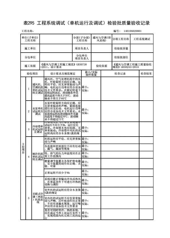 表格名称:140106020801 工程系统调试(单机运行及调试)检验批质量验收记录