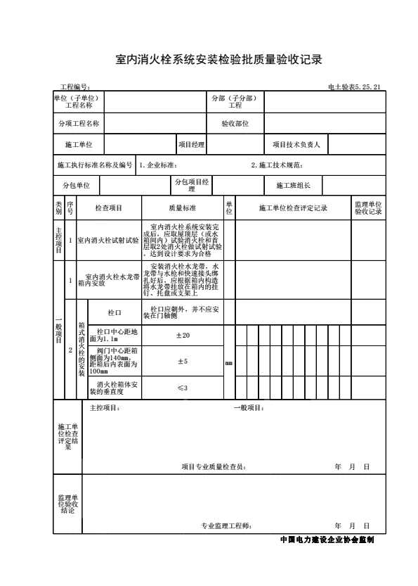 表格名称:电土验表5.25.21 室内消火栓系统安装检验批质量验收记录