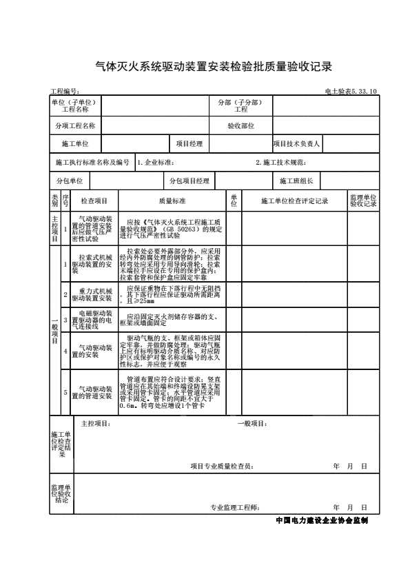 表格名称:电土验表5.33.10 气体灭火系统驱动装置安装检验批质量验收记录