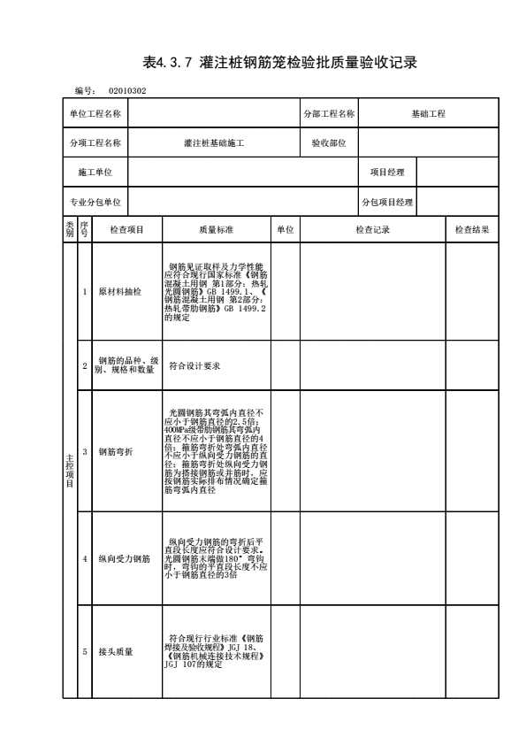 表格名称:表4.3.7 灌注桩钢筋笼检验批质量验收记录