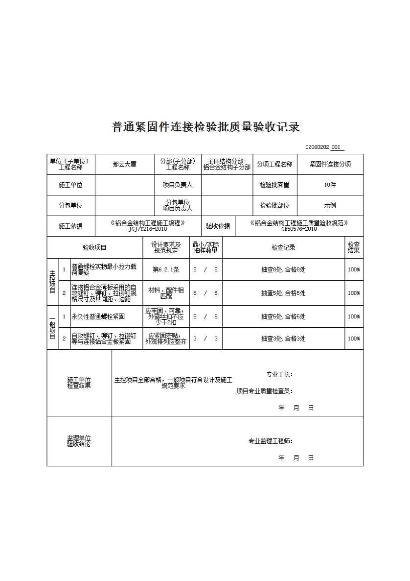 本表适用于铝合金结构制作和安装中的普通螺栓、铆钉、自攻螺钉拉铆钉等连接工程的质量验收。